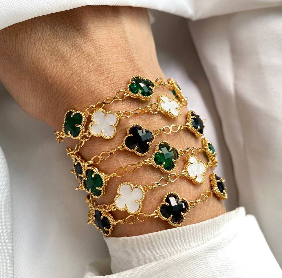 •  Pulseira de trevo e detalhes dourados, uma peça sofisticada e cheia de significado. O trevo, símbolo de sorte e proteção, com seu brilho misterioso e elegante, contrastando harmoniosamente com o acabamento dourado, que traz um toque de luxo e modernidade.